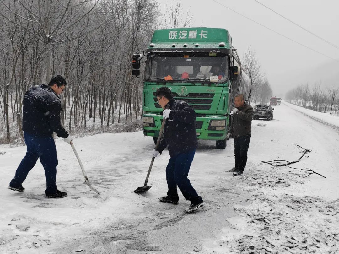 同時(shí),大秦公司第一時(shí)間與交通、路政等部門(mén)取得聯(lián)系,在說(shuō)明情況后,爭(zhēng)取了政府相關(guān)部門(mén)支持,項(xiàng)目各部門(mén)職工頂風(fēng)雪、冒嚴(yán)寒進(jìn)行道路鏟雪、撒鹽等行動(dòng)。經(jīng)過(guò)幾個(gè)小時(shí)不間斷作業(yè),雪卻越下越大,無(wú)法滿足正常通行條件,車輛依然不具備通行條件,被滯留原地。公司與電廠積極溝通,協(xié)調(diào)搶險(xiǎn)物資供應(yīng),支援力量為恢復(fù)通行、供暖保電提供了有力支撐。在全體職工連續(xù)30多個(gè)小時(shí)撒鹽、鏟雪等行動(dòng)的奮戰(zhàn)下,道路恢復(fù)了通行,載滿100噸石灰石的物資供應(yīng)車到達(dá)電廠,后續(xù)7輛物資供應(yīng)車也陸續(xù)抵達(dá)項(xiàng)目現(xiàn)場(chǎng),保障了物資正常供應(yīng),平穩(wěn)渡過(guò)了險(xiǎn)情。