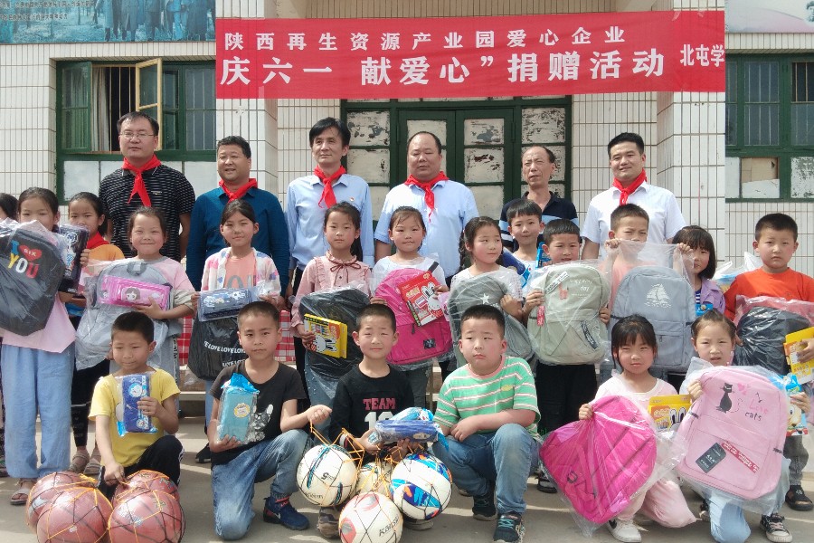 活動當天,新天地公司相關負責人同陜西再生資源產業園區各愛心企業負責人一同走進禮泉縣煙霞鎮北屯學校,為該校貧困留守兒童送去了足球、籃球、書包、文具等愛心物品。新天地公司相關負責人表示:“希望孩子們能克服困難,勤奮學習,樹立遠大理想,養成優良品德,培養過硬本領,歷煉健康身心,在校做一名好學生,在家做一個好孩子,在社會上做一位文明的小公民,不辜負家長的重托,不辜負黨和人民的期望,同時提前祝小朋友們節日快樂,茁壯成長。”